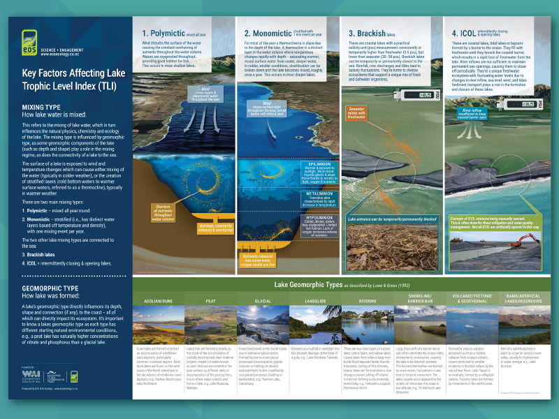 On the same topic, our Science and Science Interpretation & Design teams have developed a poster infographic for the general public illustrating the different lake mixing types, and how they can affect a lakes Trophic Level Index (TLI) – a measure of ecosystem health. It also describes the different types of lakes we have in Aotearoa. This was produced through the ‘Wai Connection’ project, and you can download an A3 PDF of the poster for free below or email info@eosecology.co.nz for free A0 poster artwork for your printer (yep, we’ll provide that artwork and printers specifications for free as well!).